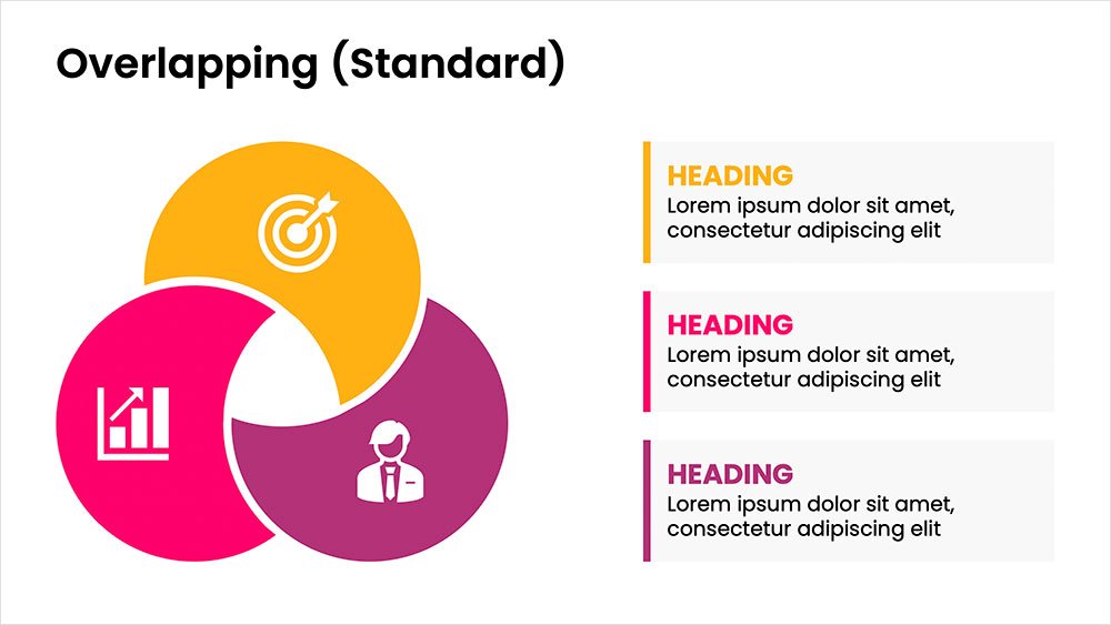 Displays shared areas or intersections, useful for showing commonalities in Venn diagrams.