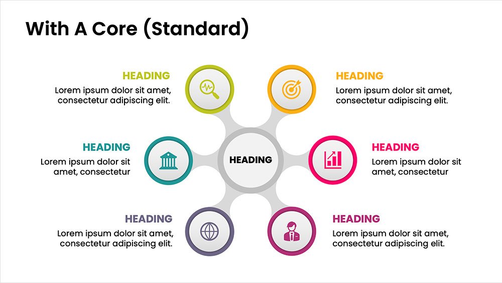 Emphasizes a central hub that connects surrounding elements, ideal for mind maps.