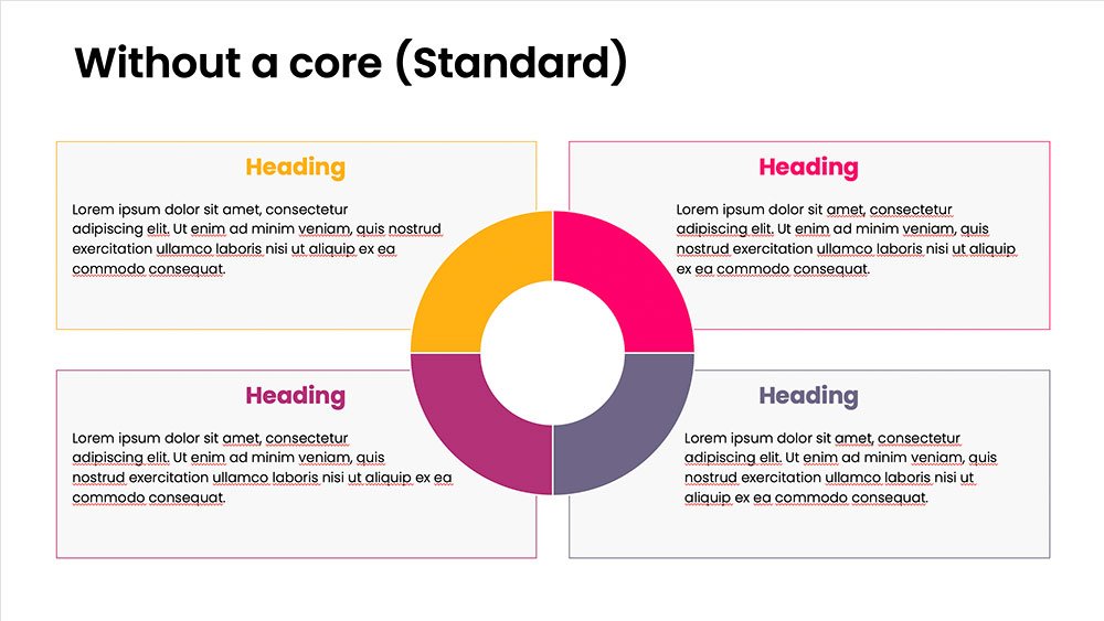 This concept shows elements extending outward from a central point, typically illustrating a spread or influence. It can be depicted with or without a core and represents a central idea that radiates outwards.
