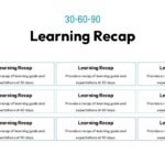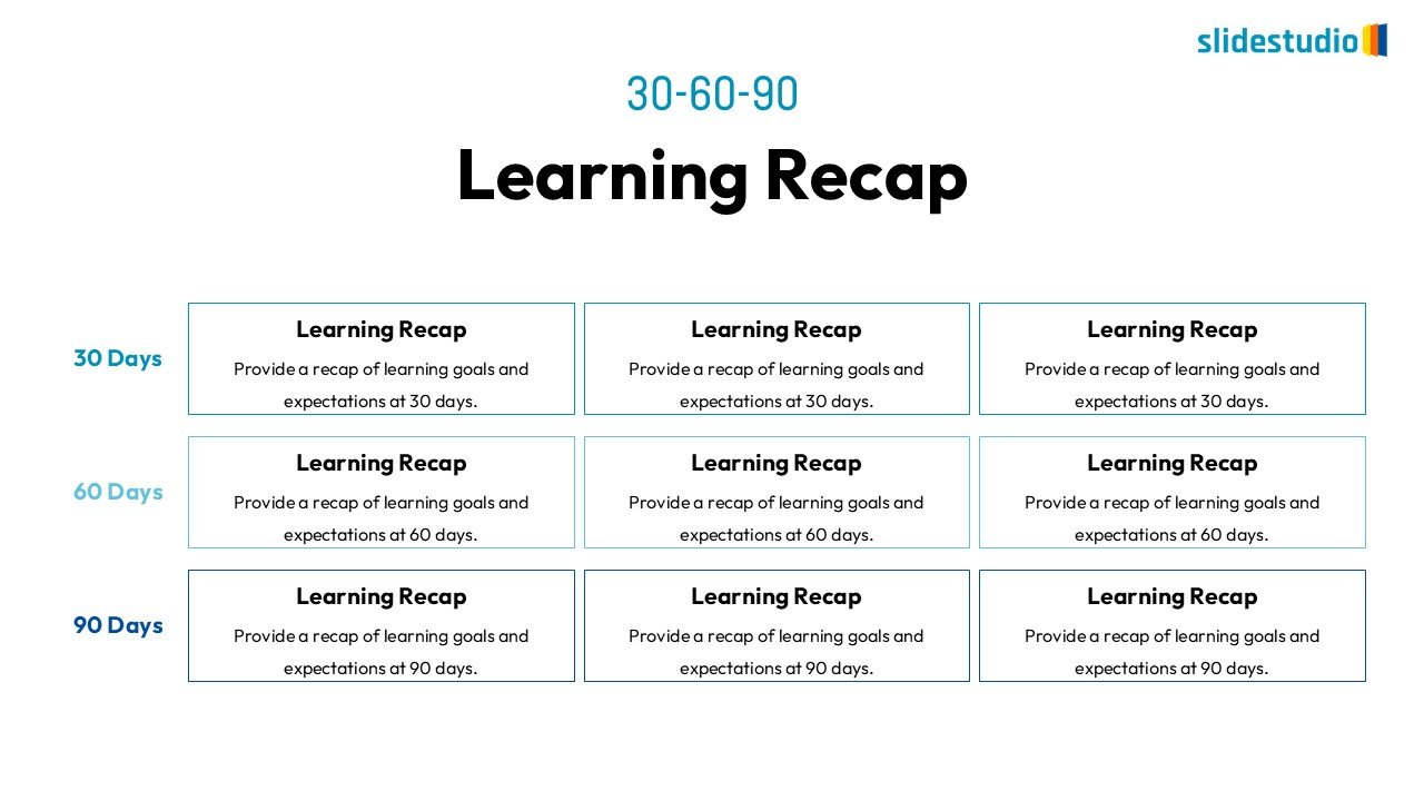 This strategic slide provides a “Learning Recap” for a “30-60-90” day plan, designed for clear progress tracking and accountability. The slide is structured into three horizontal rows, each representing a key period: “30 Days,” “60 Days,” and “90 Days.” Within each row, three rectangular text boxes are provided, each clearly labeled “Learning Recap” and containing a placeholder prompt to “Provide a recap of learning goals and expectations” for the respective timeframe. This grid-based layout offers a clear and organized summary of learning objectives and achievements across different phases of a development or onboarding plan.