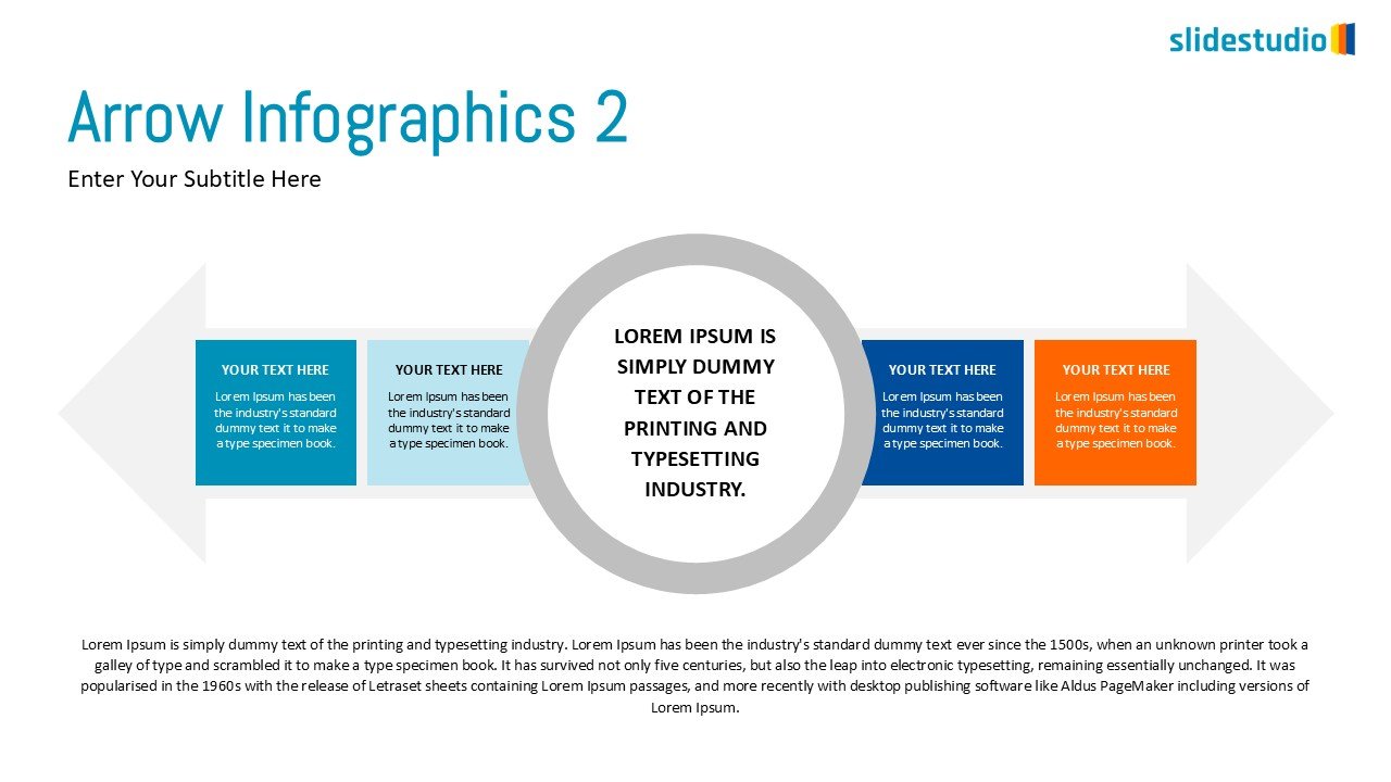 Guide your audience through your process. This linear arrow infographic features a central circle for your core message and four supporting text boxes for key details. Perfect for illustrating a process, making a comparison, or presenting a central theme with supporting points.
