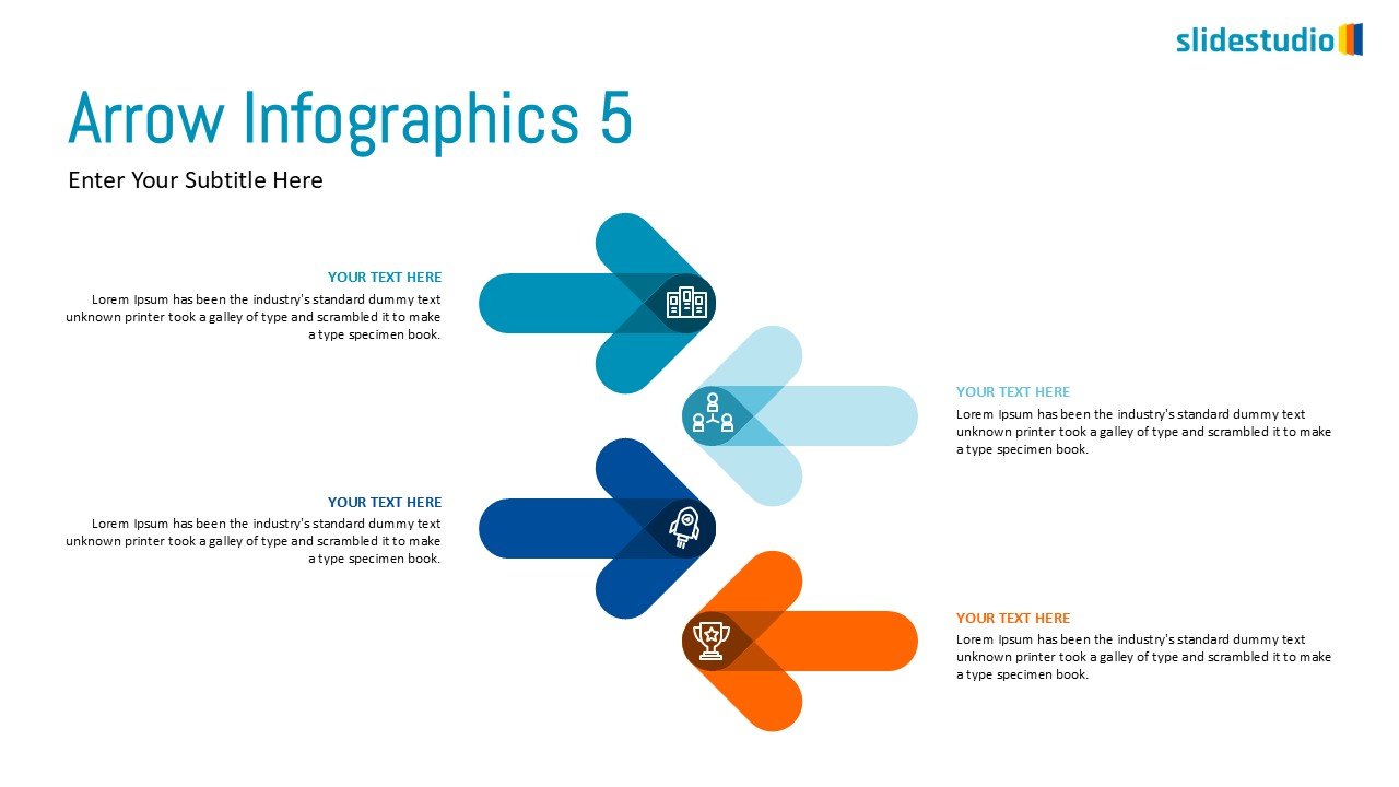 Present a clear sequence or hierarchy. This four-step arrow infographic visualizes your process with clarity. Each broad arrow segment includes a distinct icon and a dedicated text box for clear and concise descriptions. Perfect for presenting sequential steps, organizational structures, or the progression towards a goal.