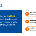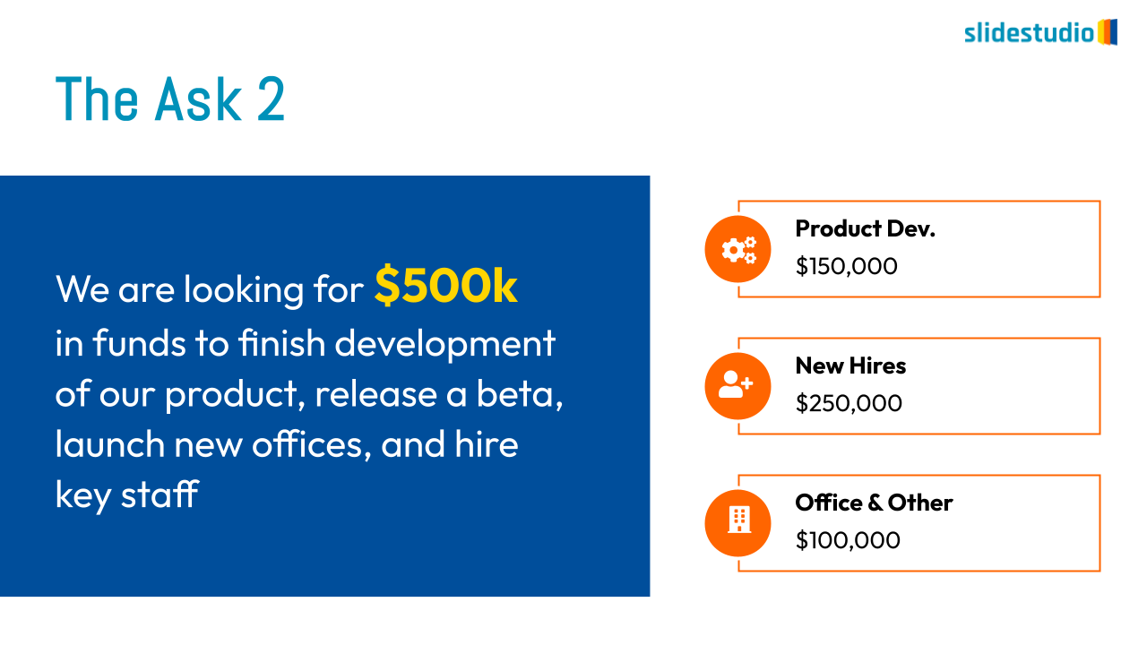 The presentation features a direct ask slide, designed to clearly state the requested funding amount and its allocation. The slide specifies the total amount being sought as “$500k” and provides a detailed breakdown of how the funds will be used for “Product Dev.”, “New Hires”, and “Office & Other”. This format is essential for a pitch deck to provide transparency and build a strong business case for investment.
