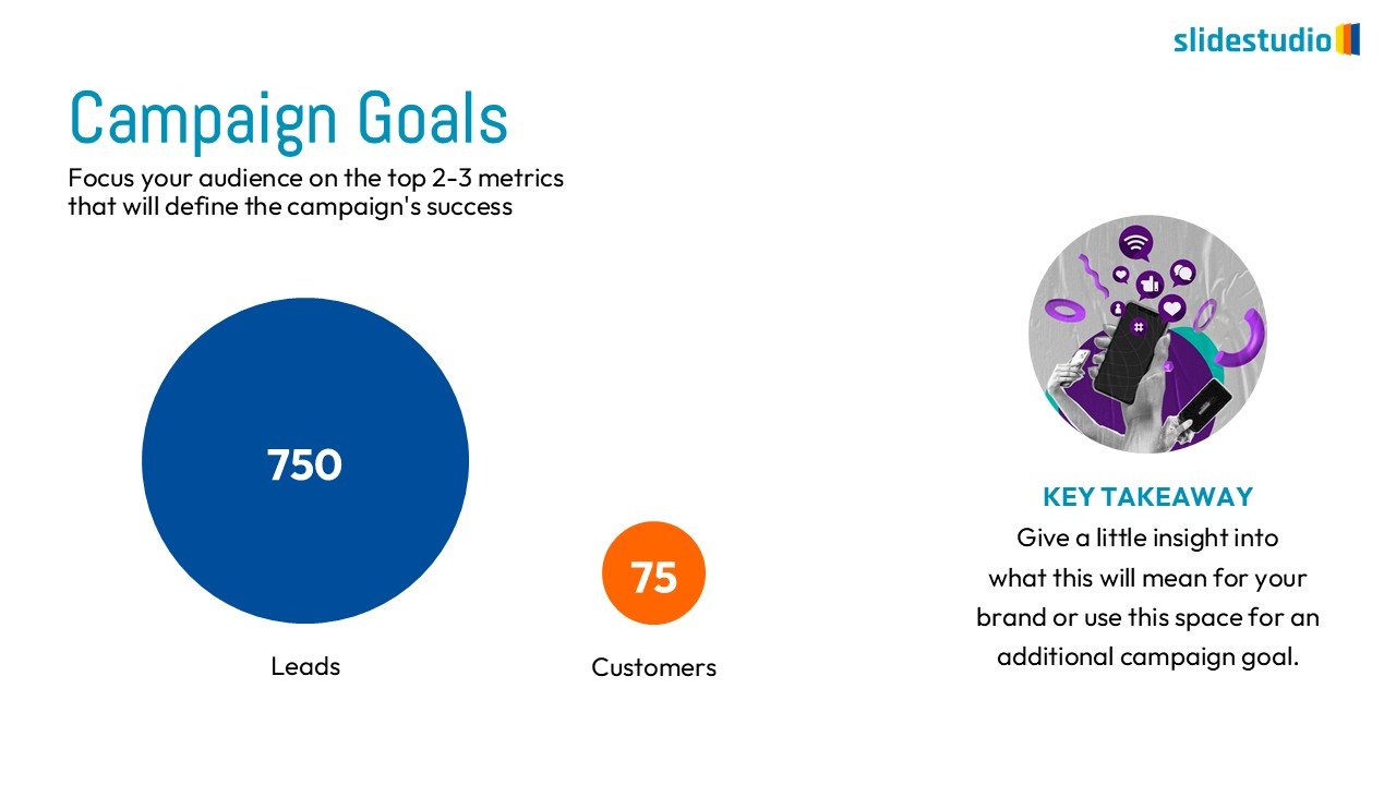The presentation features a clear and concise data visualization layout, designed to highlight key performance metrics with an accompanying section for insights or additional goals. Its prominent circular data displays and dedicated takeaway area allow for easy comprehension of critical numbers and their implications, making it perfect for campaign goal reporting, KPI dashboards, performance summaries, or strategic objective presentations. This template is highly beneficial for marketing analysts, project managers, business leaders, and sales teams who need to effectively communicate achieved results and future targets.