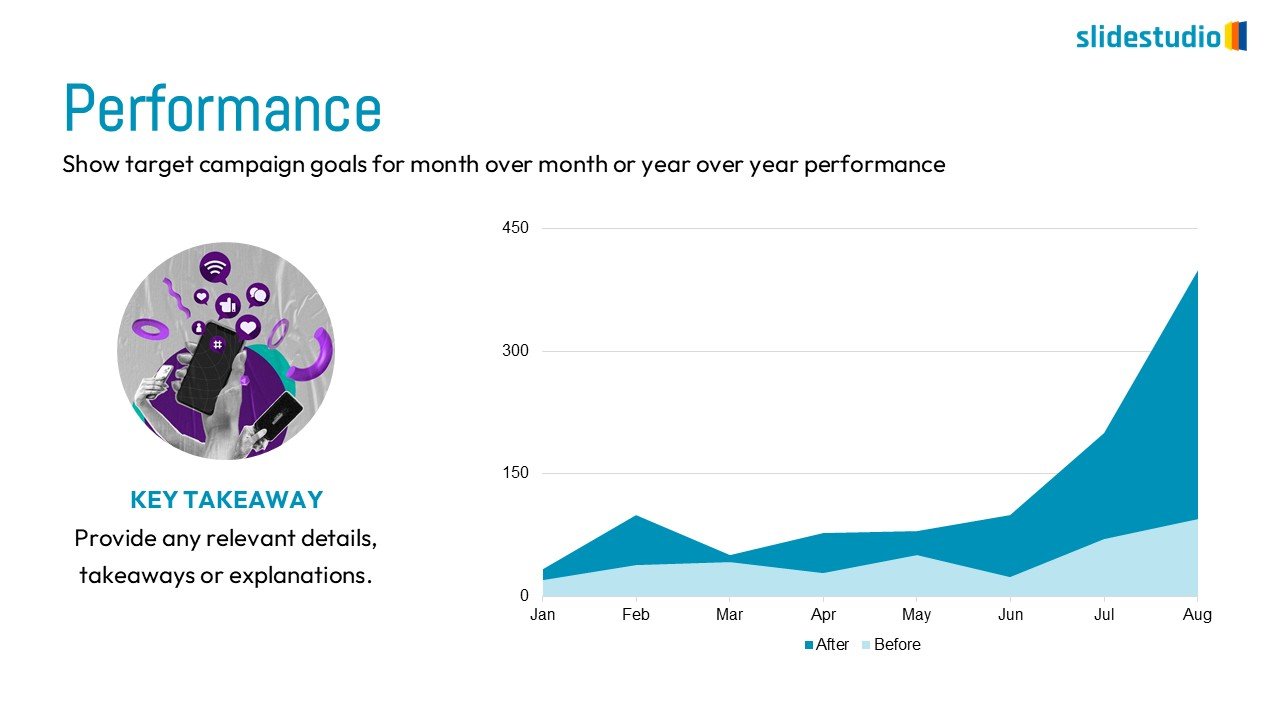 The presentation offers a dynamic area chart for trend visualization and a dedicated section for key takeaways and explanations. Its data-driven design allows for clear comparison of performance over time, making it ideal for month-over-month or year-over-year performance reviews, campaign effectiveness analysis, growth tracking, or before-and-after scenario comparisons. This template is highly beneficial for marketing analysts, business strategists, financial planners, and project managers who need to illustrate performance trends and provide actionable insights.