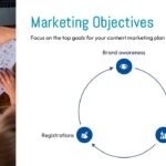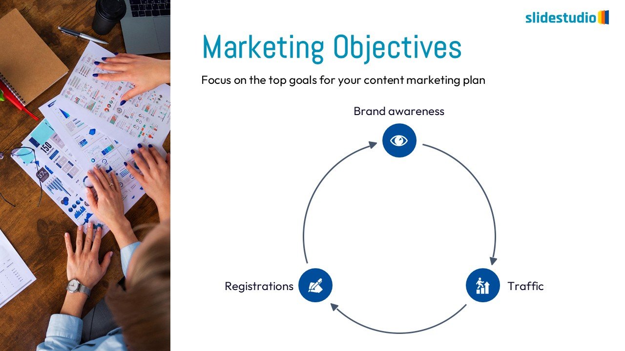 The slide features a prominent “Marketing Objectives” title and a subheading that reads “Focus on the top goals for your content marketing plan.” A cyclical diagram illustrates three interconnected objectives: “Brand awareness” (with an eye icon), “Registrations” (with a person icon), and “Traffic” (with a bar chart icon). This layout is highly effective for outlining the core goals of a content marketing strategy and demonstrating their interconnectedness, making it ideal for marketing teams or strategists to present their objectives to stakeholders or clients.