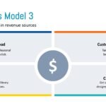 This Google Slide visually details “Business Model 3” for “slidestudio,” highlighting its four primary revenue sources. These revenue streams include template downloads for professional slides, custom color scheme services, and access to a large library of icons for download. Additionally, the company offers custom pitch deck design services tailored to unique stories. The slide presents these offerings in a clear, quadrant-based layout with a central dollar sign icon.