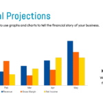 The presentation features a financial projections slide, designed to visually represent a company’s financial forecast using a clustered bar chart. The chart tracks “Revenue,” “Gross Margin,” and “Net Income” over a five-month period. This format is ideal for a business plan or pitch deck to effectively communicate the “financial story” of the business and demonstrate a clear path to profitability and growth.
