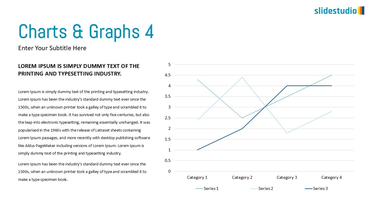 This analytical slide features a clean and modern line graph on the right, displaying three data series (Series 1, Series 2, Series 3) across four distinct categories. The lines use varying shades of blue, effectively illustrating trends and comparisons over time or across different groups. A subtle gridline background aids in precise data reading. The left side of the slide is dedicated to a substantial text block, providing ample space for detailed explanations, insights, or a comprehensive analysis of the trends depicted in the graph. This slide is ideal for trend analysis, forecasting, performance tracking, or any presentation requiring the visualization and explanation of data progression.