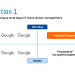 The presentation features a competitive landscape analysis slide designed to visually position a company’s product against its competitors using a two-by-two matrix. The chart contrasts different market approaches, such as “All In One” versus “Variety” and “Marketplace” versus “Store”. The slide prominently places the company’s “Pitch Deck Template” in a unique quadrant, supporting the claim that it “doesn’t have direct competitors”. This is an essential slide for a pitch deck or business plan to demonstrate market awareness and competitive advantage.