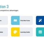 The Google Slide, titled “Competition 3,” outlines “Our sustainable competitive advantages.” It visually presents six distinct advantages, each in a rectangular box with a colorful icon on the left and a descriptive text on the right. These advantages include “All In One,” “Only Real Cases,” “Unique Services,” “Free Update,” “Learning Center,” and “Fast Support,” effectively summarizing key strengths of the entity presented.