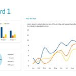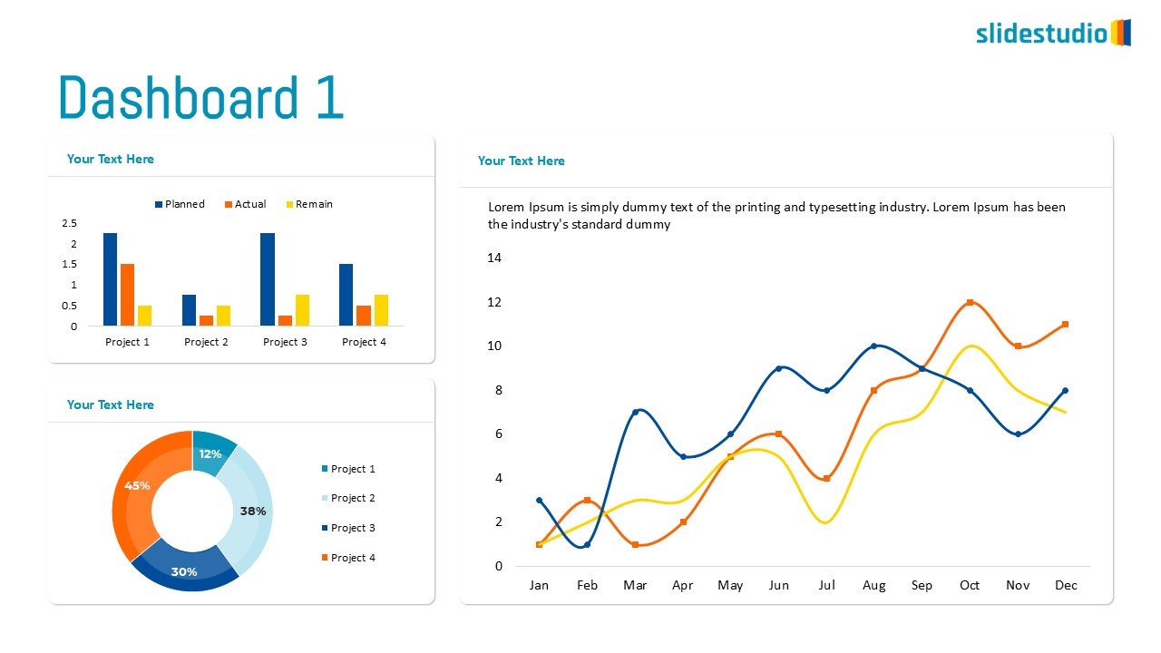 This comprehensive dashboard slide provides a multi-faceted view of data through three distinct chart types, neatly organized within a clean white layout. The upper-left quadrant features a stacked bar chart, comparing “Planned,” “Actual,” and “Remain” metrics across four projects, offering insights into project performance. Below it, a donut chart breaks down project contributions by percentage (45% orange, 30% dark blue, 12% light blue, 38% teal). The right side of the slide is dominated by a line graph, illustrating trends over a 12-month period (January to December) across three data series. Each chart area includes a “Your Text Here” placeholder, allowing for customization and specific data context. This slide is ideal for presenting project dashboards, financial summaries, or general business performance reports, enabling a quick and comprehensive overview of key metrics and trends.
