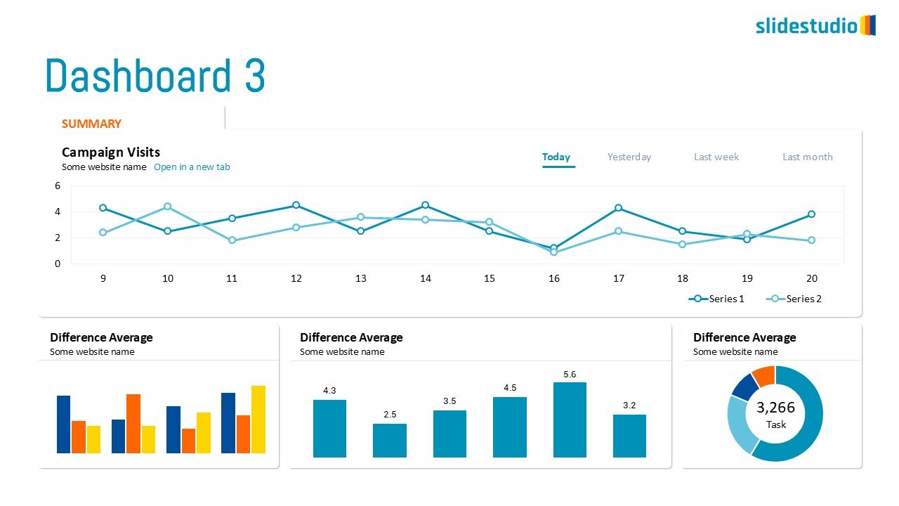 This comprehensive dashboard slide offers a data-rich overview with a primary focus on “Campaign Visits” and supporting analytical charts. The upper section is dominated by a line graph tracking “Campaign Visits” over time (days 9-20) for two series, with options to view data for “Today,” “Yesterday,” “Last week,” and “Last month.” Below this, three smaller panels provide additional insights, each titled “Difference Average.” The first panel features a bar chart with blue, orange, and yellow bars comparing various metrics. The second panel displays a simple bar chart with numerical values. The third panel showcases a donut chart indicating “3,266 Task” within a blue and teal distribution. This slide is ideal for digital marketing reports, website analytics, or performance dashboards, providing a quick yet detailed snapshot of key performance indicators and trends.