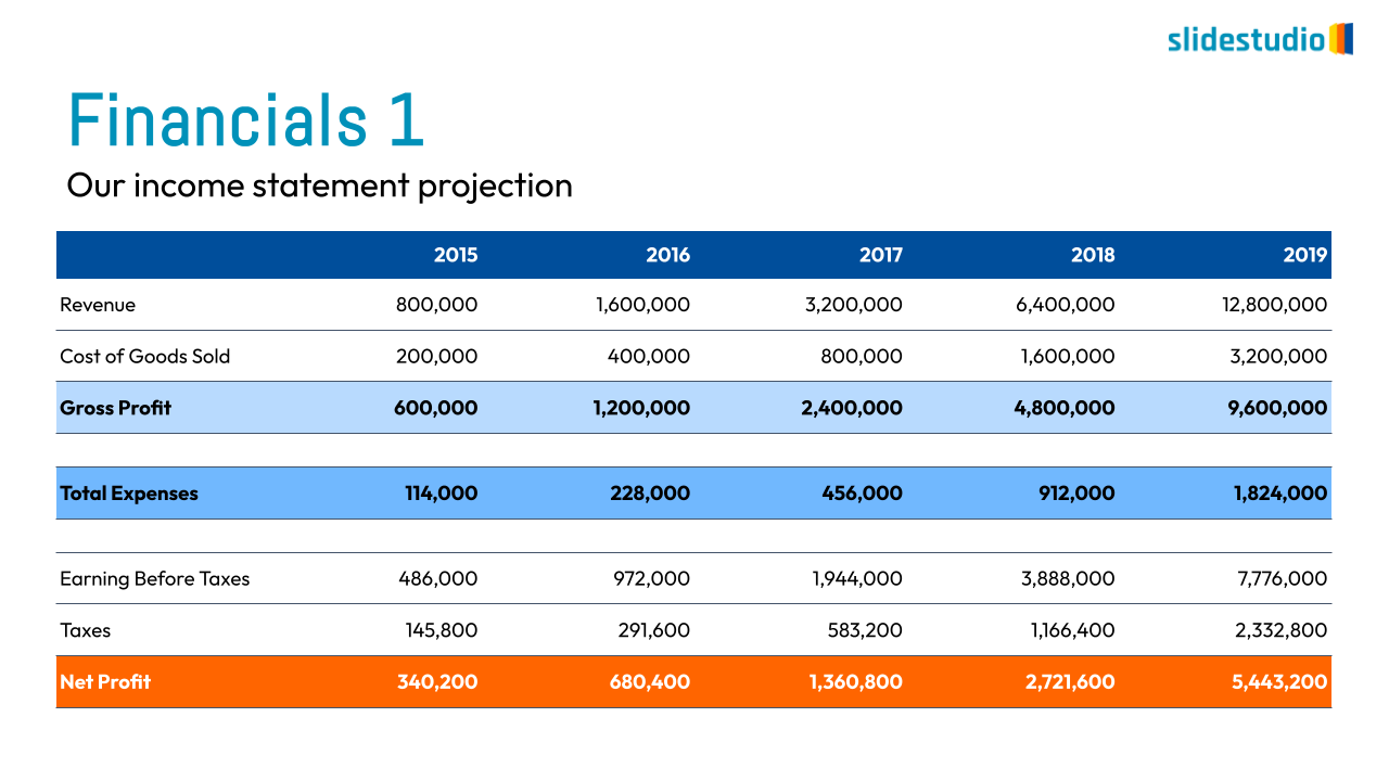 Demonstrate your financial vision. This five-year financial projection slide clearly outlines key metrics like revenue, expenses, and net profit in a table format. Perfect for a pitch deck or business plan, it helps you showcase a scalable and profitable business model with a consistent pattern of growth to potential investors or stakeholders.