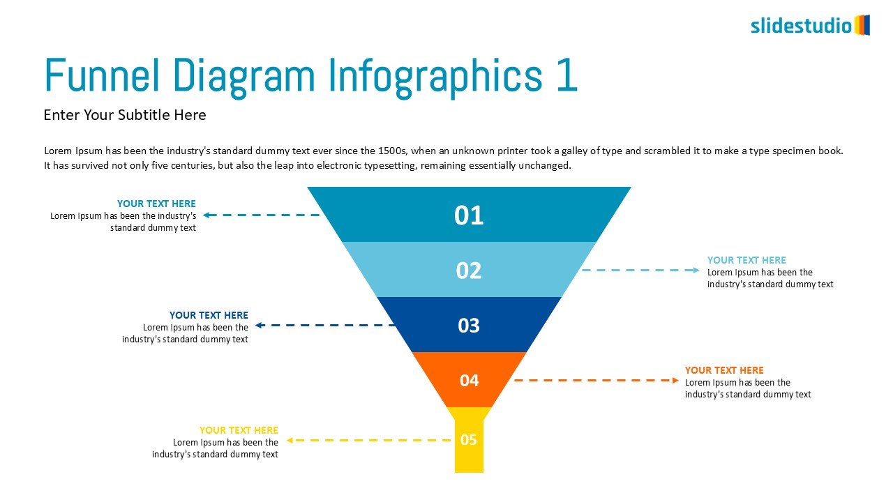 This highly effective funnel diagram slide visually represents a sequential process of filtration or progression, clearly illustrating five distinct stages from broad input to refined output. Each horizontal segment of the funnel is numerically labeled and extends to a dedicated text box, allowing for detailed explanations of each phase. This versatile template is perfect for showcasing sales pipelines, marketing funnels, conversion processes, or any strategy where a step-by-step reduction or refinement of elements is critical for understanding.