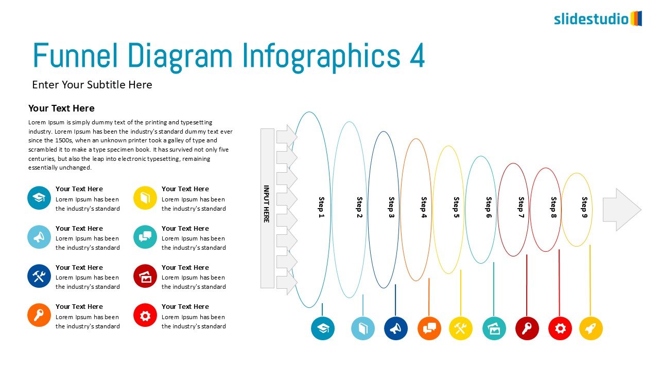 This expansive multi-stage funnel diagram graphically depicts a process with a clear beginning and end, flowing from a broad input through nine distinct, vertically integrated steps. Each numbered stage along the horizontal flow is accompanied by a customizable icon and a dedicated text placeholder, ensuring comprehensive detail at every phase. This versatile template is ideal for showcasing extensive pipelines, detailed strategic roadmaps, or any lengthy sequential process requiring precise categorization and progression tracking.