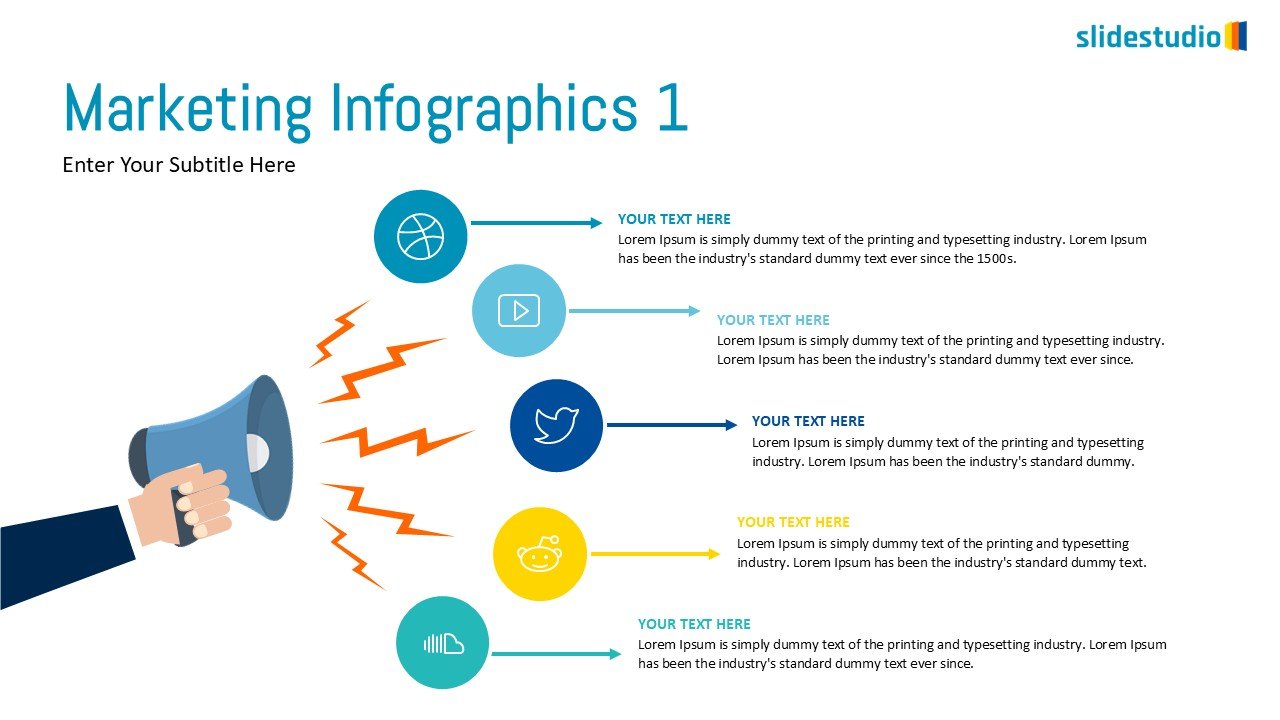 This engaging infographic slide prominently features a large, dynamic megaphone graphic on the left, symbolizing communication and outreach, with sound waves extending towards the right. Five distinct circular nodes, each with an icon and dedicated text placeholder, are aligned horizontally, providing clear pathways for information dissemination. This versatile layout is ideal for presenting communication strategies, detailing outreach initiatives, or showcasing key messages and their impact in a visually compelling and easy-to-understand format.