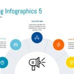 This engaging semi-circular infographic slide features a central megaphone icon, signifying communication or promotion, surrounded by an arc of five distinct data points. Each point is represented by a circular node with an icon and a dedicated text block, providing ample space for detailed explanations. This versatile layout is perfect for showcasing key messages, outlining communication strategies, or highlighting multiple contributing factors to a central theme, offering a clear and dynamic visual for audience engagement.
