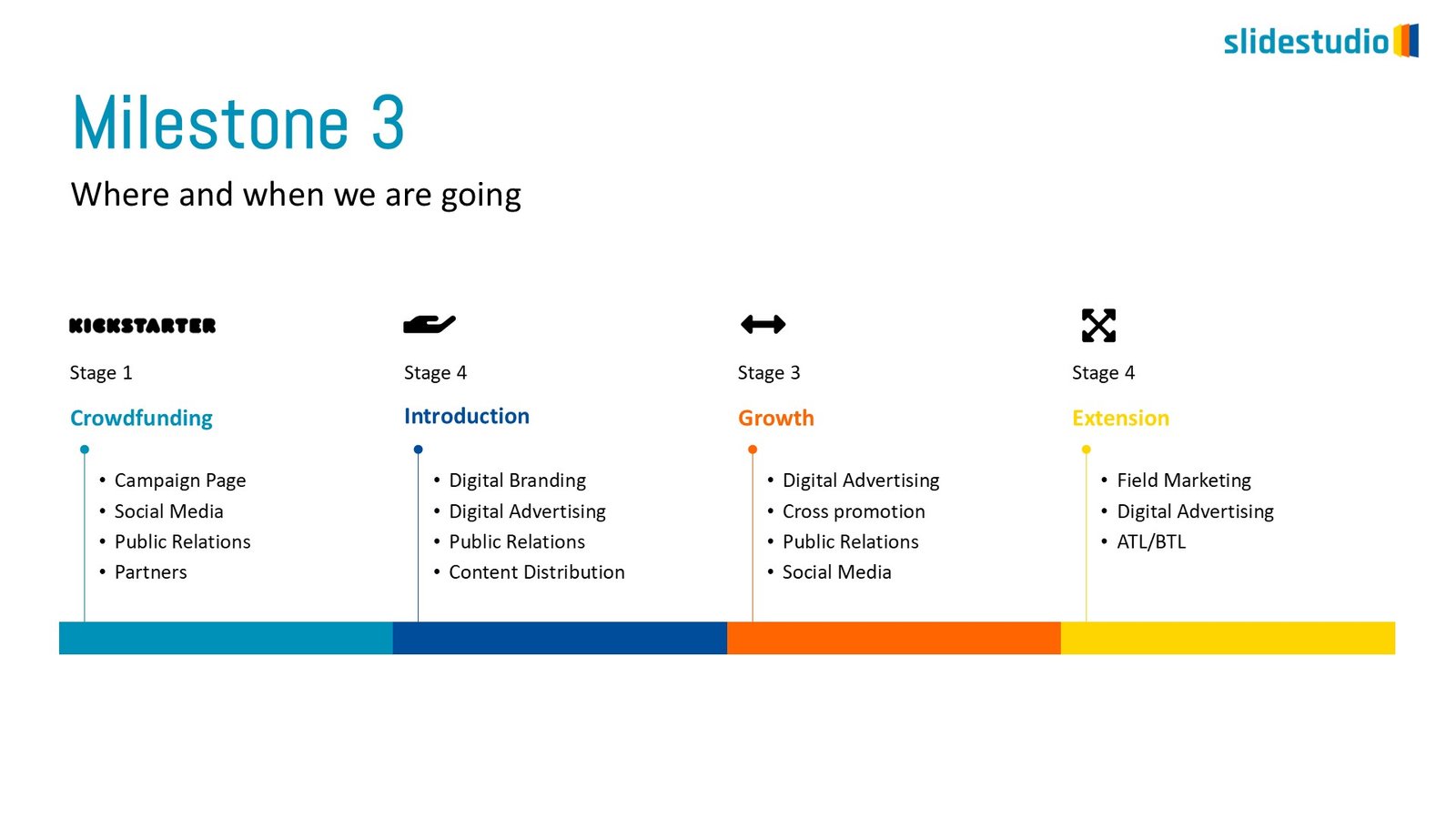 This Google Slide details Milestone 3 of a project, outlining a strategic plan across four distinct phases. It visually represents these stages – Crowdfunding, Introduction, Growth, and Extension – with corresponding marketing and business development activities such as social media, digital advertising, and public relations. A clear, color-coded timeline at the bottom supports the progression of these activities. The slide provides a structured overview of where and when the project is going.