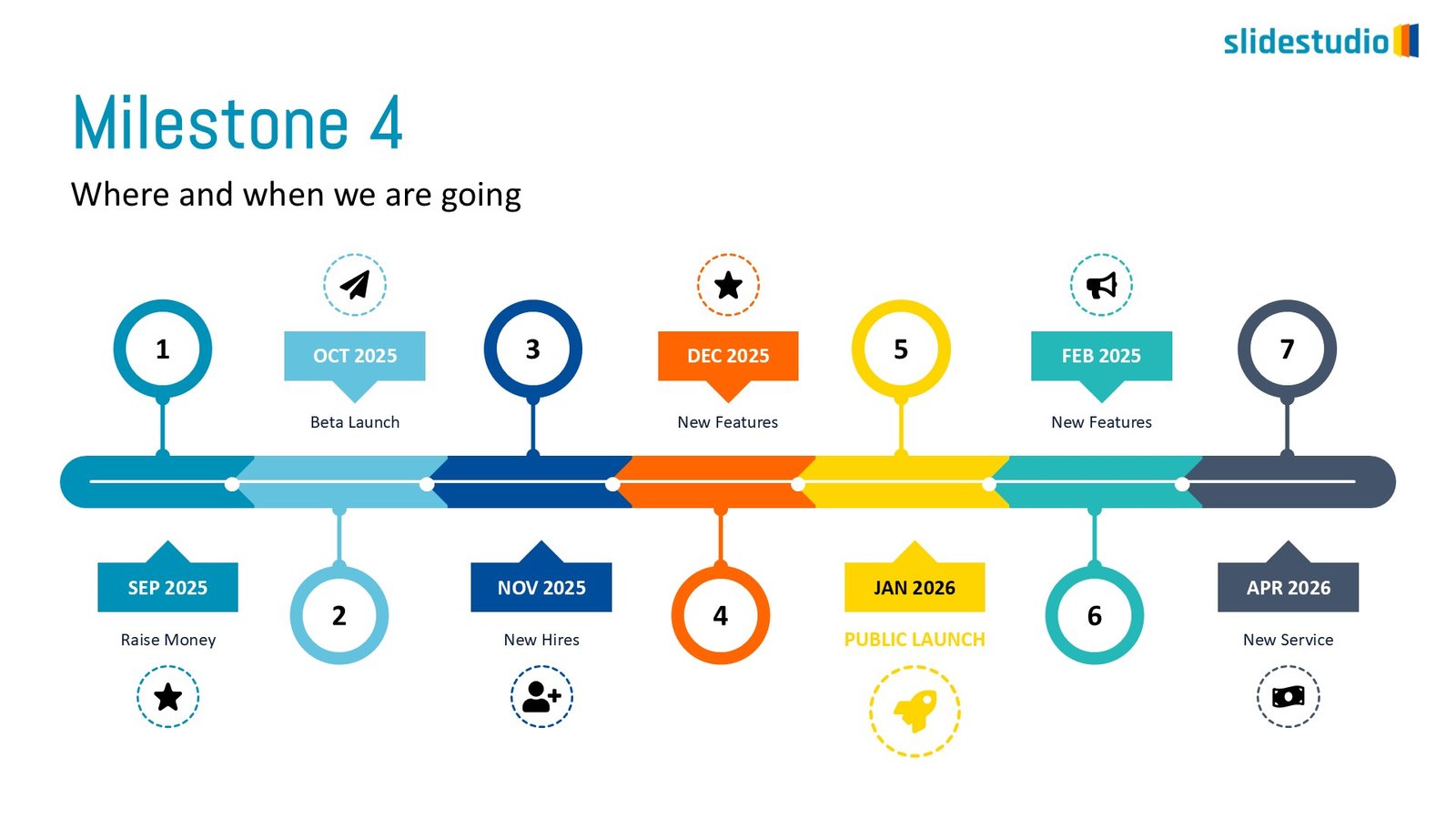 This Google Slide image displays a detailed timeline titled Milestone 4, outlining key strategic points from September 2025 to April 2026. It features seven distinct milestones, each represented by a numbered circle, a date, a concise description of the event (e.g., Raise Money, Beta Launch, Public Launch), and a relevant icon. The timeline visualizes project progression, showing various phases and key achievements in a clear, sequential format.