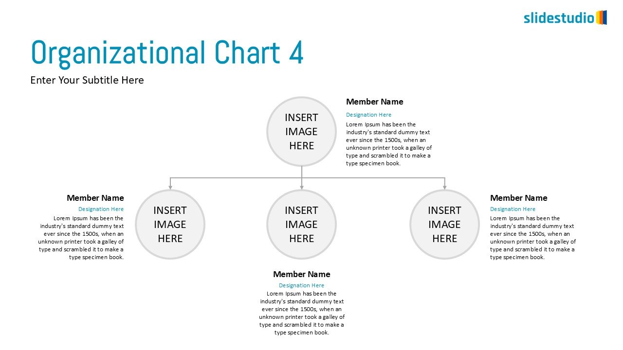 This clean and professional organizational chart slide provides a clear hierarchical structure, showcasing a top-level position branching into three mid-level roles, each with a dedicated text block for additional information. Every position is represented by a circular placeholder for an image, accompanied by designated text fields for ‘Member Name’ and ‘Designation.’ This versatile layout is ideal for presenting small to medium-sized team structures, project leadership, or clear reporting lines, ensuring immediate understanding of roles and relationships within any group.