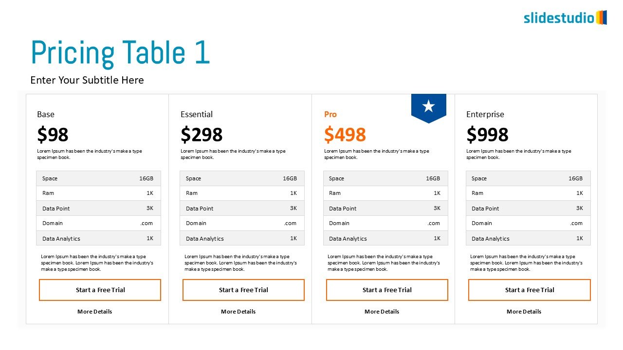 Present your pricing with clarity. This pricing table slide outlines four distinct plan options—Base, Essential, Pro, and Enterprise—with prominent pricing, a detailed list of features, and a clear call-to-action button for a free trial. Perfect for product pricing, service tiers, or subscription models, this layout enables quick decision-making for potential clients.