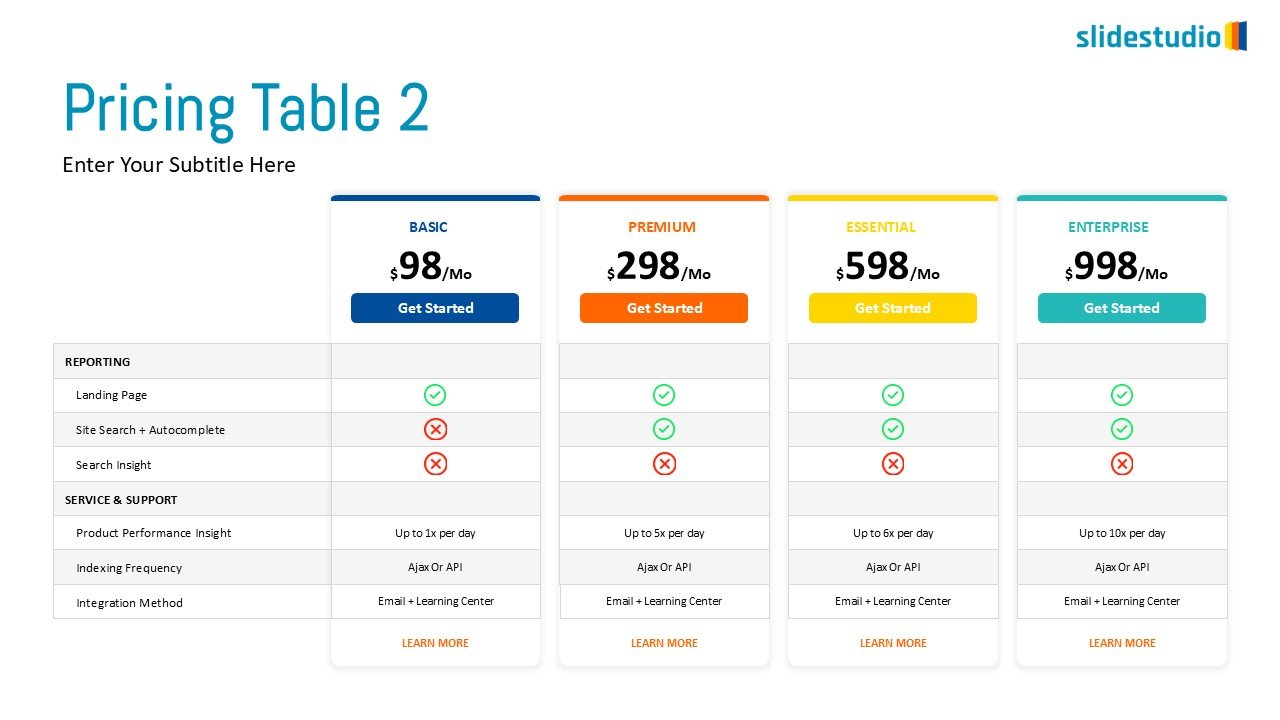 Enable your customers to choose with confidence. This detailed pricing table slide compares four distinct service tiers—Basic, Premium, Essential, and Enterprise—by highlighting key features, reporting, and service inclusions. Intuitive checkmarks and crosses make inclusions and exclusions easy to see, while prominent pricing and call-to-action buttons facilitate customer decision-making. Perfect for subscription services, software plans, or any offering that requires a clear, feature-by-feature comparison.