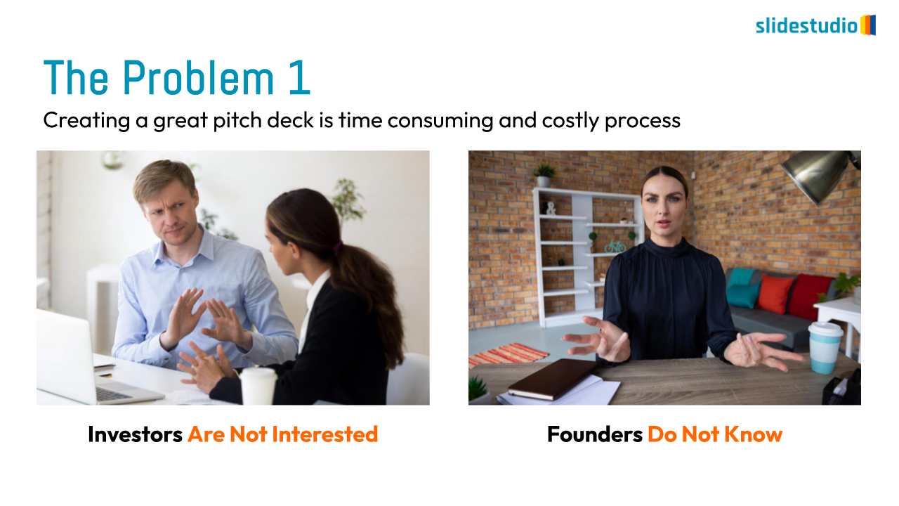 The presentation features a problem statement slide, designed to visually articulate a key business challenge using a two-column, image-based layout. It highlights the difficulties of creating a pitch deck by contrasting the perspective of “Investors Are Not Interested” with the struggles of “Founders Do Not Know”. This format is effective for quickly and empathetically establishing a problem that the rest of the presentation will aim to solve
