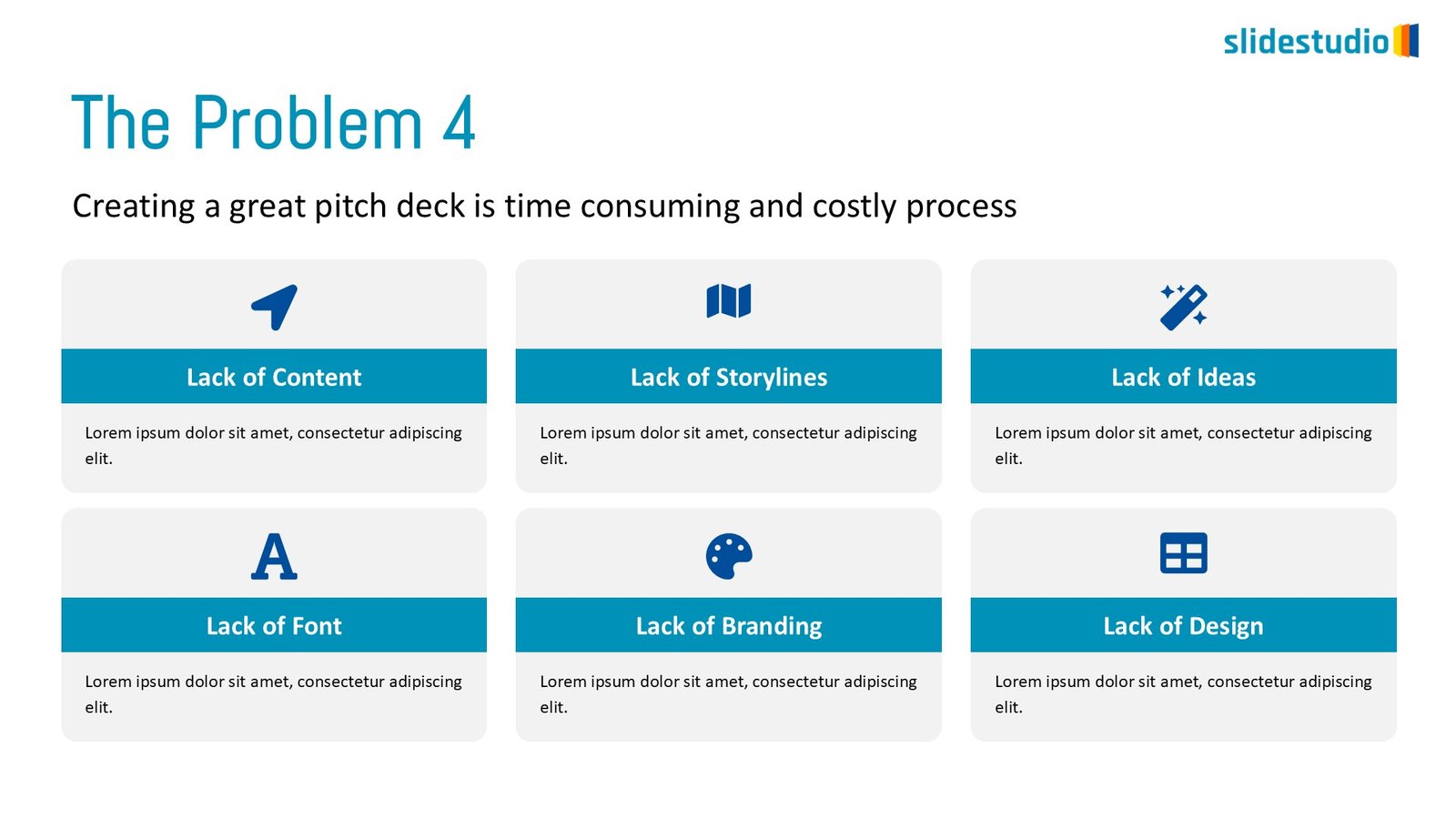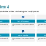 This Google Slide outlines various challenges in creating a pitch deck, stating it is a time-consuming and costly process. Six common problems are categorized and displayed in a grid format, including lack of content, storylines, ideas, font, branding, and design. Each problem is visually represented by an icon, a descriptive title, and placeholder text. The slide uses a clean design with blue and grey tones to present these issues effectively.