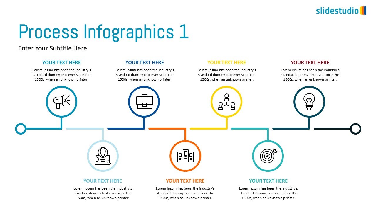 This dynamic process infographic slide visualizes a horizontal progression through six distinct, interconnected stages. Each stage is represented by a numbered circular node with an icon, and a dedicated text block for detailed explanation, alternating above and below the central timeline. This clear and engaging layout is perfect for showcasing project timelines, sequential workflows, step-by-step guides, or any process that requires a linear progression with specific points of interest.