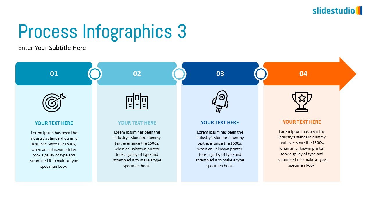 This clear and impactful process infographic slide visualizes a linear progression through four distinct, sequential stages, culminating in a forward-moving arrow. Each stage is presented within a rectangular block with a numerical label, an illustrative icon, and a dedicated text area for detailed explanations. This streamlined layout is perfect for showcasing project milestones, step-by-step procedures, or a phased approach to achieving a goal, ensuring a clear and concise communication of your process from start to finish.