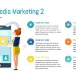 This engaging social media marketing slide features a central graphic of a smartphone with two stylized human figures interacting with it, surrounded by six distinct social media icons (Facebook, Google+, LinkedIn, Pinterest, Twitter, and YouTube) each linked to a dedicated text block for detailed explanations. This versatile layout is ideal for presenting digital marketing strategies, showcasing audience engagement across platforms, or highlighting the impact of various social channels in a visually appealing and modern format.