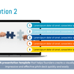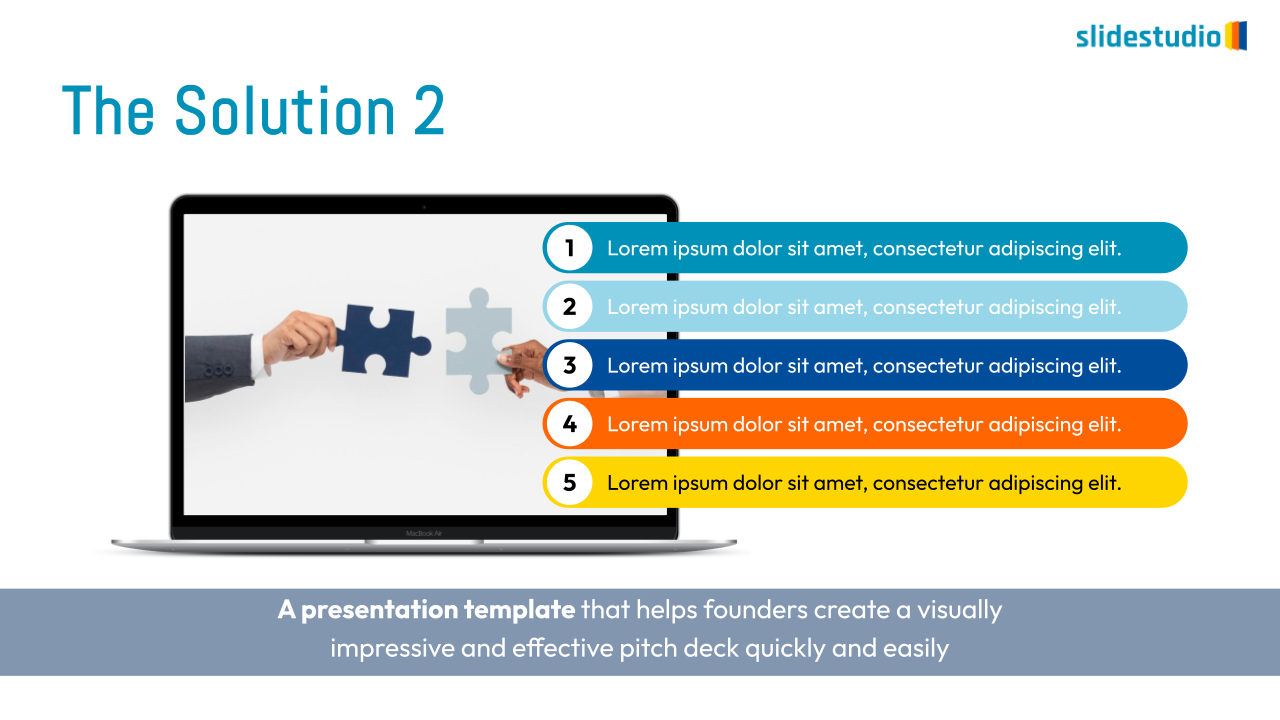 The presentation features a solution breakdown slide, designed to detail the key components of a product or service in a clear and structured manner. It uses a visual metaphor of two hands fitting a jigsaw puzzle together on a laptop screen, paired with a numbered list of five key benefits or features represented by colored bars. This format is highly effective for a pitch deck to explain how a solution works in a simple and digestible way.