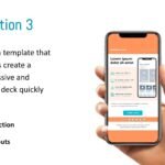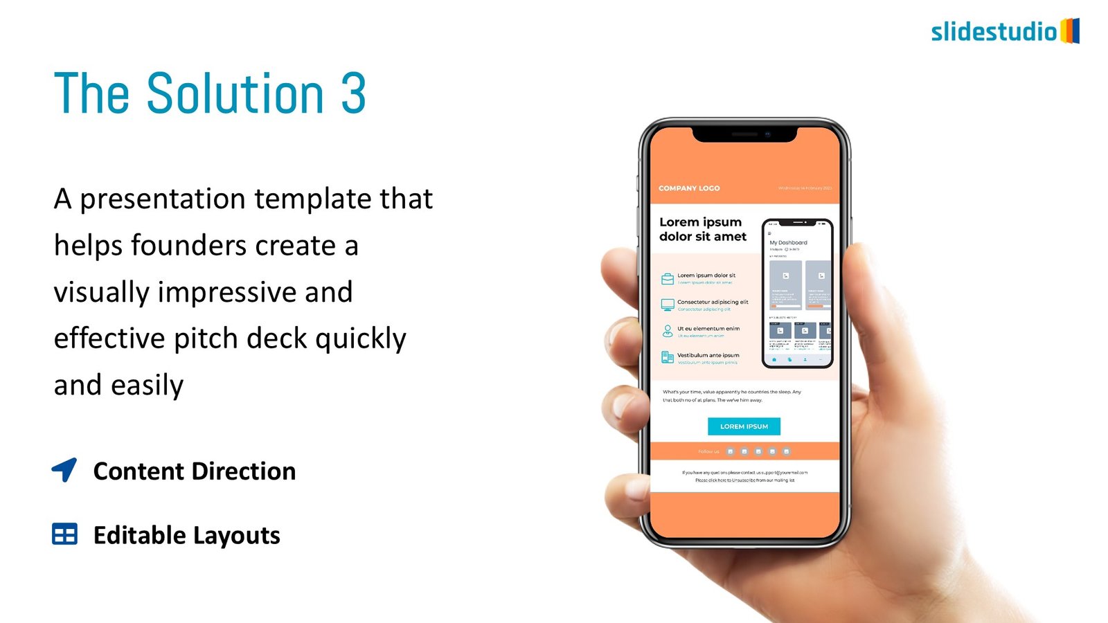This slide introduces “The Solution 3,” a presentation template specifically designed to help founders quickly create visually impressive and effective pitch decks. It highlights key features such as content direction and editable layouts. A prominent graphic of a hand holding a smartphone showcasing a mobile application interface reinforces the modern, digital nature of the solution, branded by slidestudio.