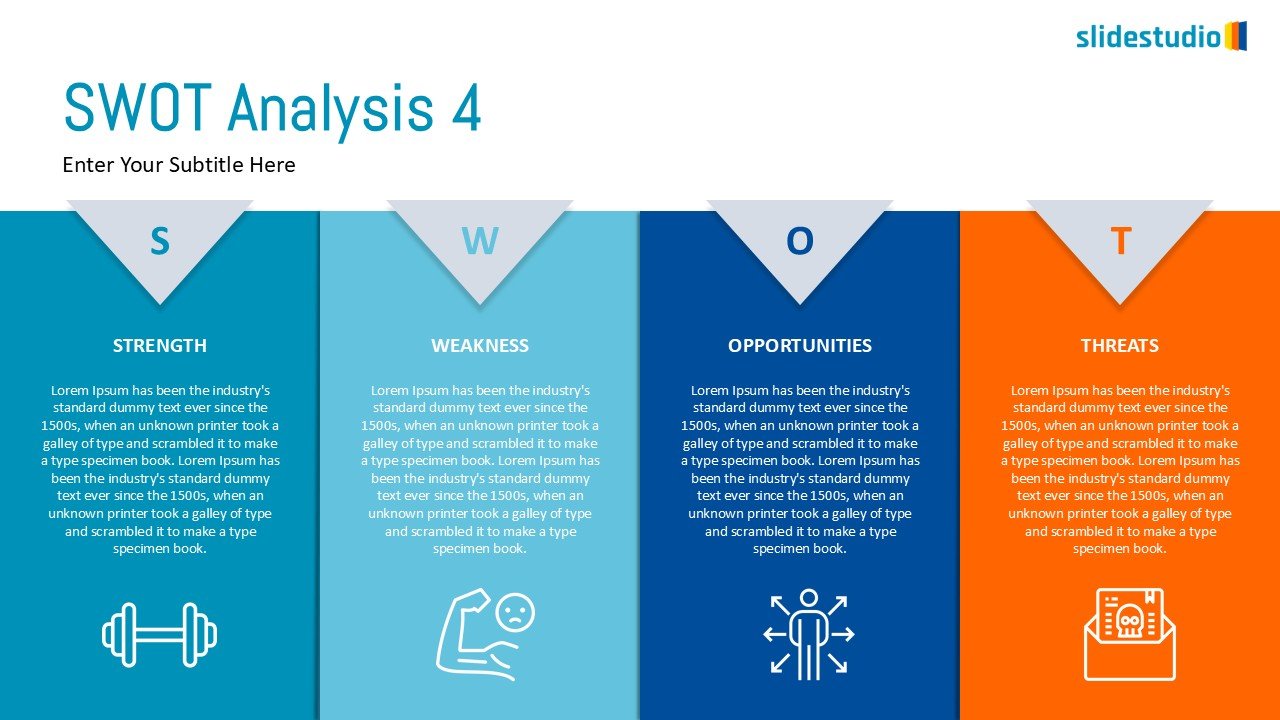 This analytical SWOT Analysis slide offers a bold and professional framework for evaluating a subject’s internal and external factors. It features four distinct, color-coded vertical columns for “STRENGTH,” “WEAKNESS,” “OPPORTUNITIES,” and “THREATS,” each topped with a large initial (S, W, O, T) and a relevant icon at the bottom. Ample text space is provided for detailed descriptions within each category. This visually striking and clear layout is ideal for strategic planning, comprehensive business assessments, or competitive analysis, enabling a thorough and impactful overview of any situation.