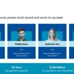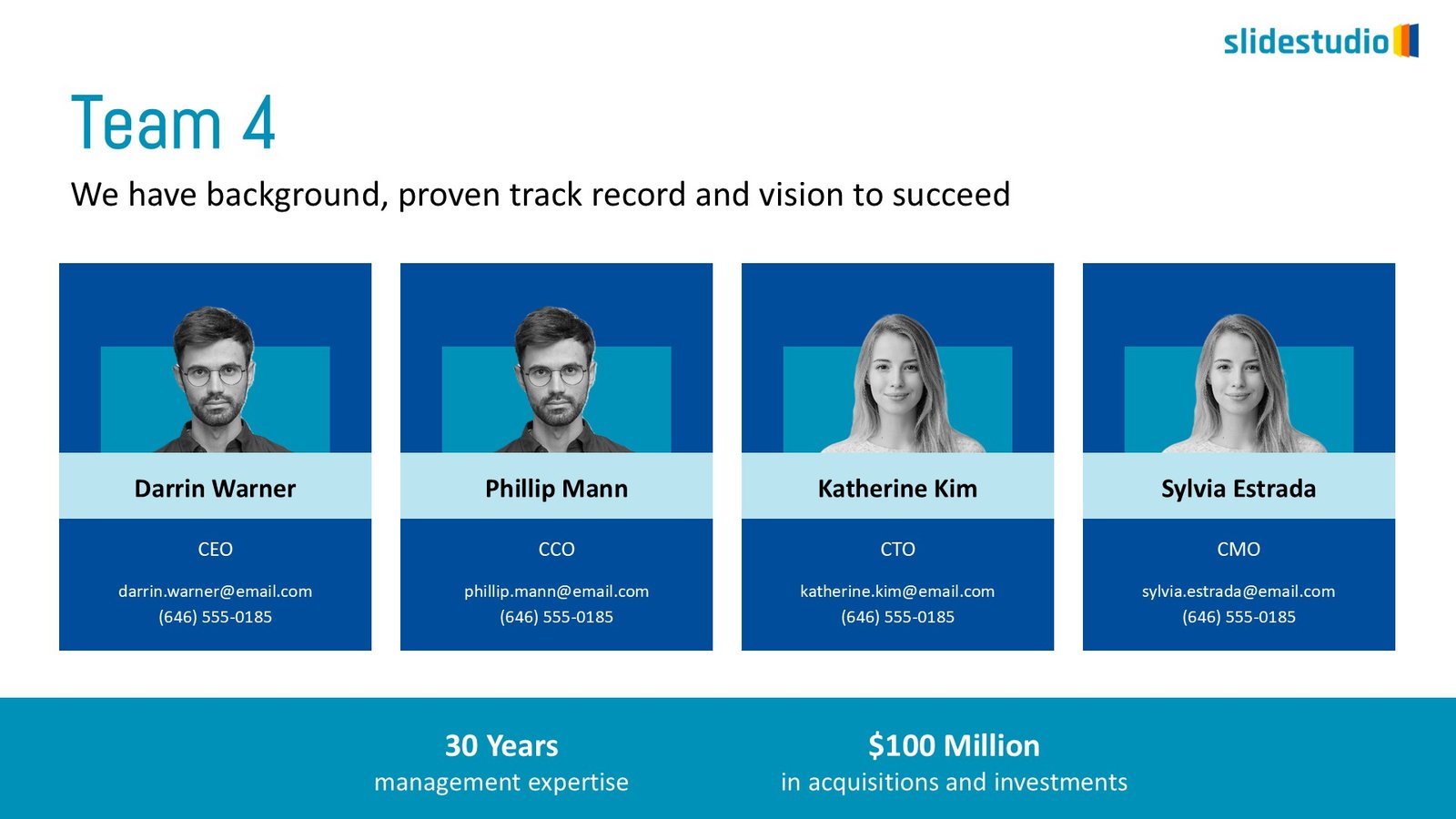 This Google Slide presents “Team 4,” emphasizing their background, proven track record, and vision. It showcases four key members: Darrin Warner (CEO), Phillip Mann (CCO), Katherine Kim (CTO), and Sylvia Estrada (CMO), complete with their contact details. The slide also highlights the team’s collective strengths, including “30 Years management expertise” and “$100 Million in acquisitions and investments.” The overall design is clean and professional, using a blue color scheme.