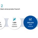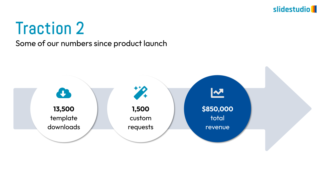 The presentation features a traction slide designed to showcase a company’s key performance metrics since product launch. It uses a horizontal arrow to visually connect three circular icons, each with a different metric: template downloads, custom requests, and total revenue. This layout provides a clear and compelling overview of a company’s early success and market validation, making it an excellent component for a pitch deck to demonstrate progress.